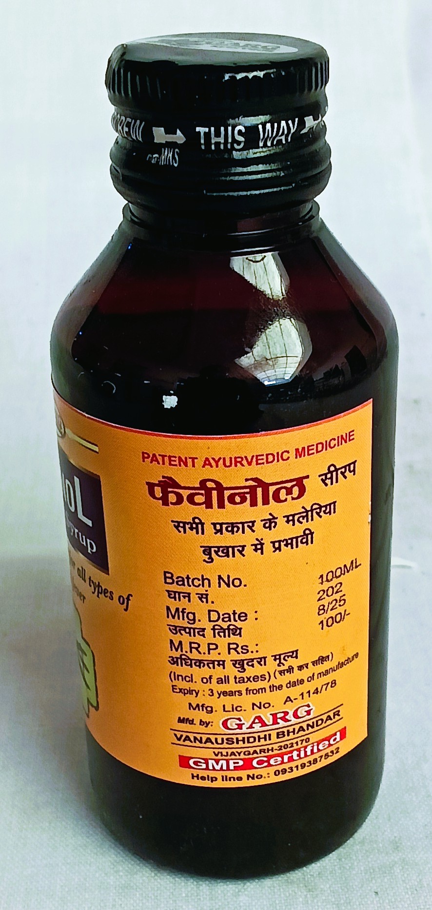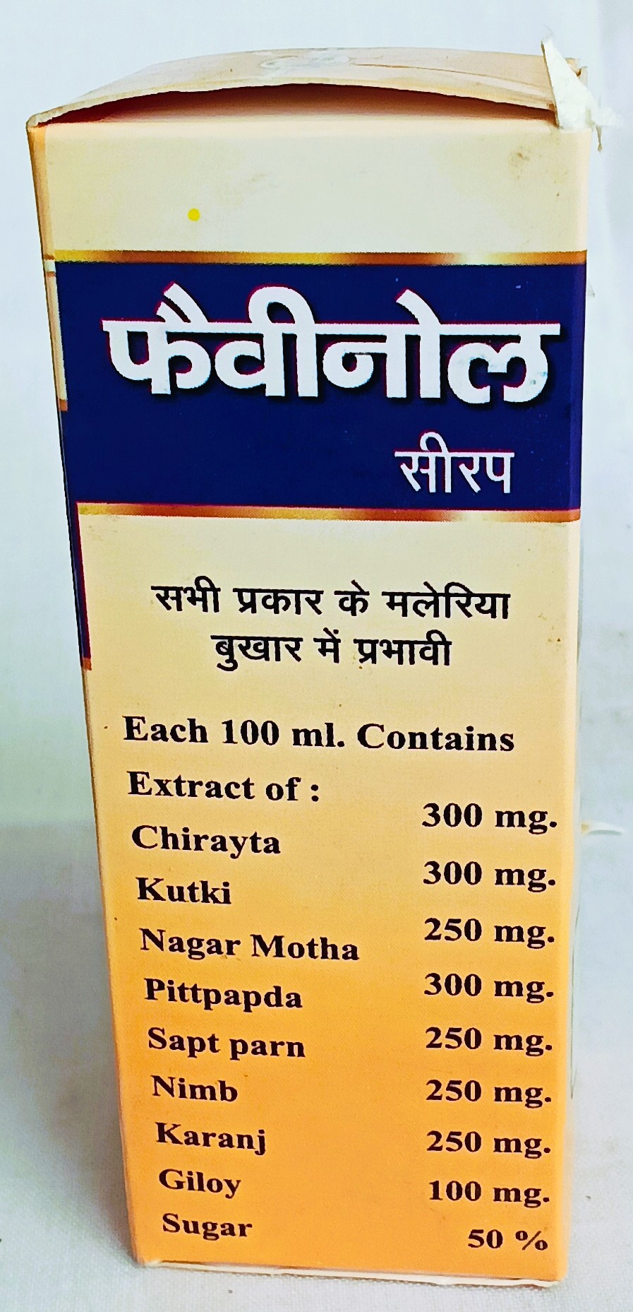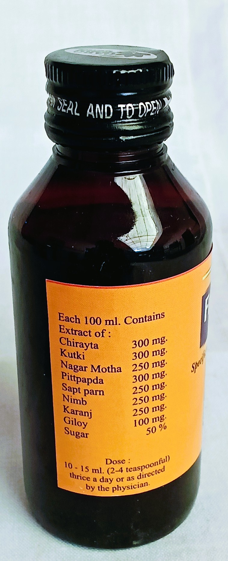 घटक – 100 मिली. में घटकों की मात्रा- चिरायता 300 मिग्रा., कुटकी 300 मिग्रा., नागरमौथा 300 मिग्रा., पिŮापापड़ा 300 मिग्रा., सप्तपर्ण 250 मिग्रा., निम्बत्वक 250 मिग्रा., करंज 250 मिग्रा., गिलोय 100 मिग्रा., चीनी 50ř, सोडियम बेंजोएट 05 ग्राम/लिटर।