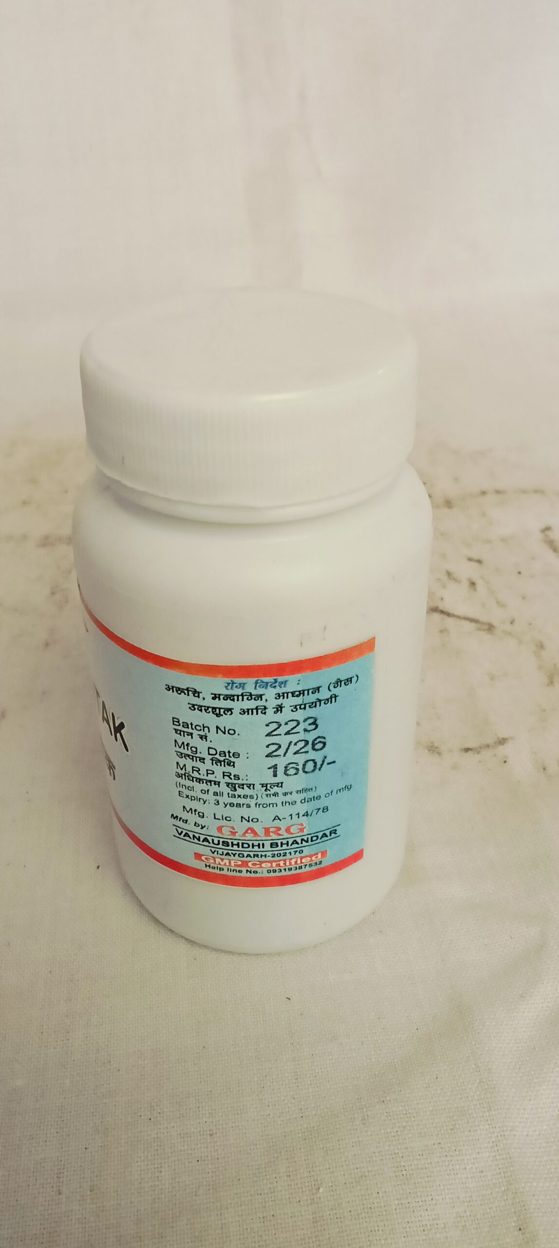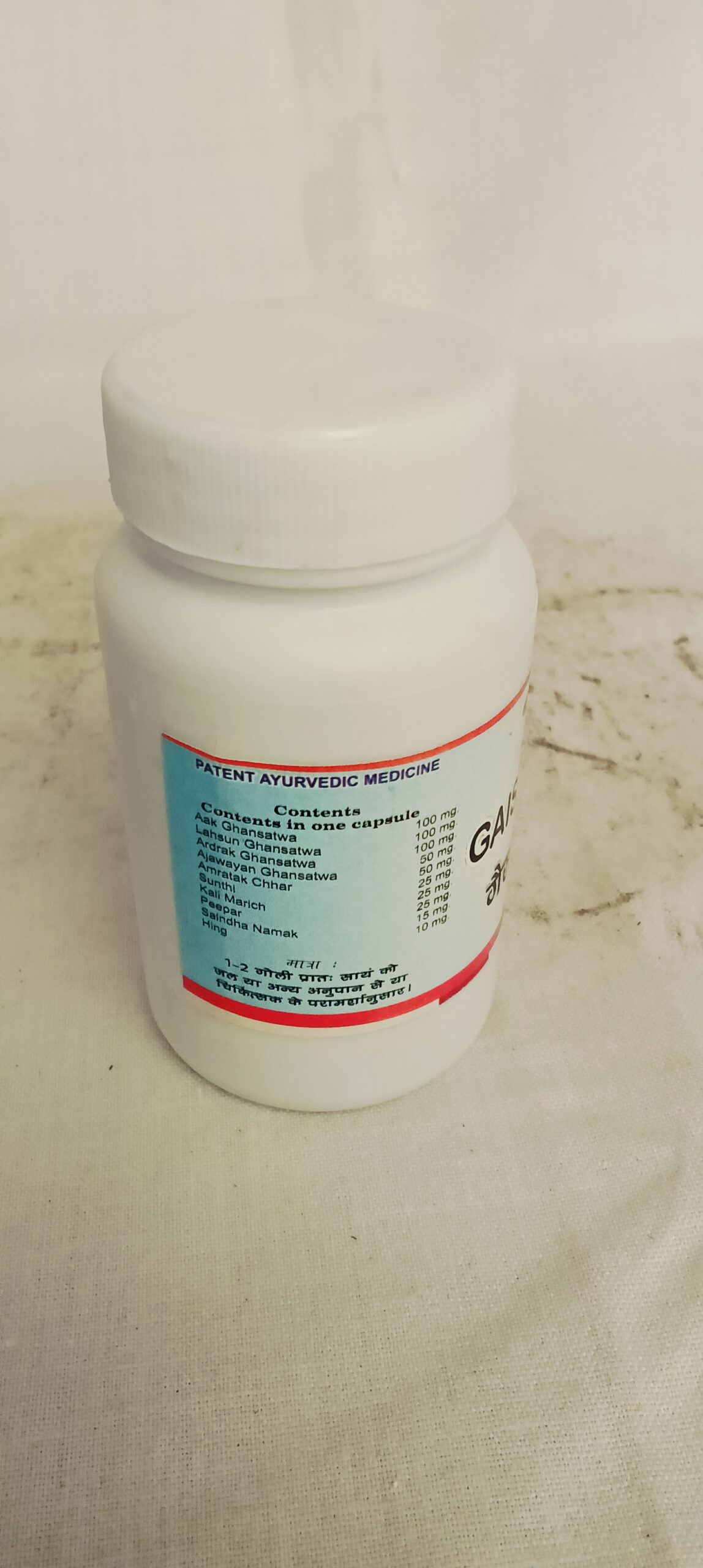 घटक – 1 कैपसूल में घटकों की मात्रा – आक घनसत्व 100 मिग्रा., आर्द्रक घनसत्व 100 मिग्रा., लहसुन 100 मिग्रा., अजवायन घनसत्व 50 मिग्रा., अमृतक क्षार 50 मिग्रा., सोंठ 25 मिग्रा., कालीमरिच 25 मिग्रा., पीपर 25 मिग्रा., अजवायन 25 मिग्रा., सेंधानमक 25 मिग्रा., काला नमक 25 मिग्रा. हींग 10 मिग्रा.