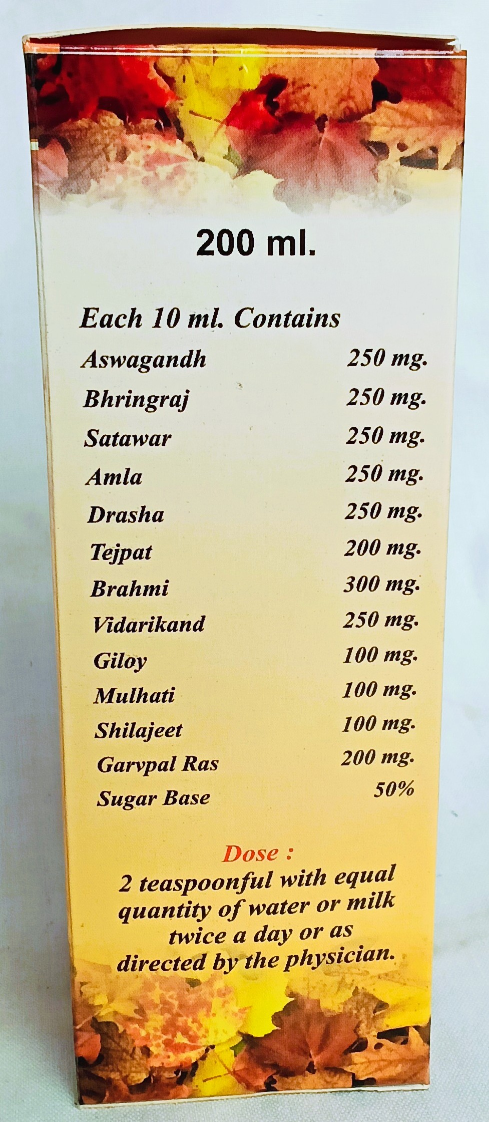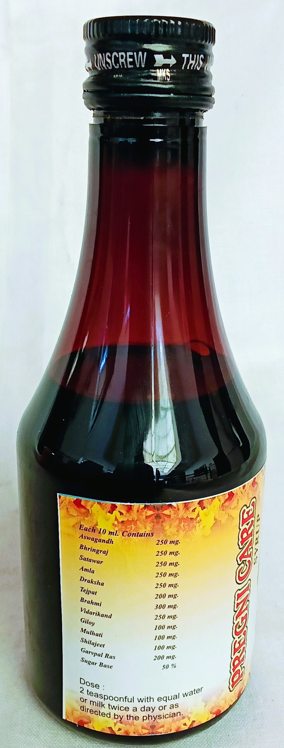 घटक – 100 मिली. में घटकों की मात्रा- अश्वगंधा 250 मिग्रा., भृंगराज 250 मिग्रा., शतावर 250 मिग्रा., आंवला 250 मिग्रा., द्राक्षा 250 मिग्रा., तेजपात 200 मिग्रा., ब्राăी 300 मिग्रा., विदारीकंद 250 मिग्रा. गिलोय 100 मिग्रा., मुलहठी 100 मिग्रा., गर्भपाल रस 100 मिग्रा., चीनी 50ř , सोडियम बेंजोएट 0.5 ग्राम/लिटर।