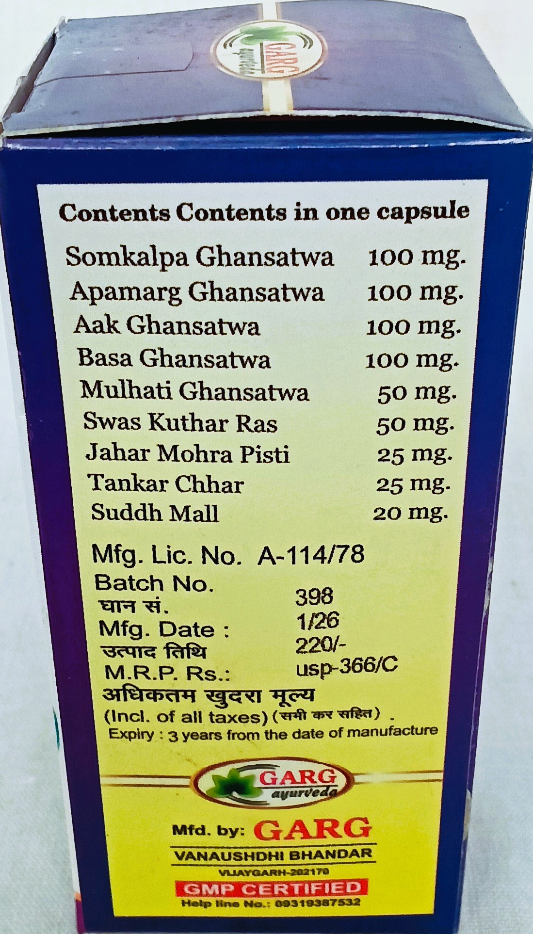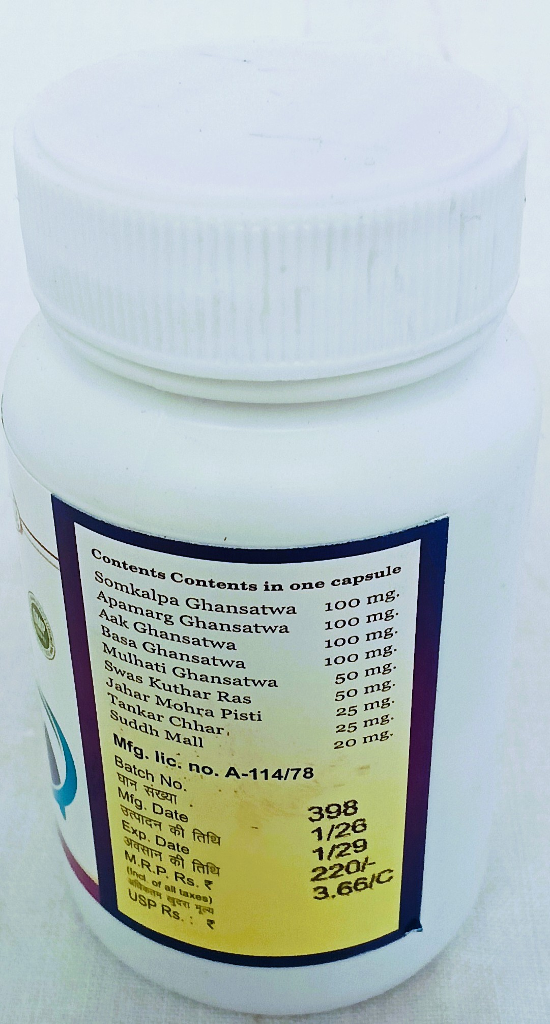 घटक- 1 कैपसूल में घटकों की मात्रा – सोमकल्प घनसत्व 100 मिग्रा., श्वासकुठार रस 50 मिग्रा. अपामार्ग घनसत्व 100 मिग्रा., जहरमोहरा पिष्टी 25 मिग्रा. आक घनसत्व 100 मिग्रा., टंकण क्षार 25 मिग्रा., वासा घनसत्व 100 मिग्रा., शु0 मल्ल 20 मिग्रा., मुलहठी घनसत्व 50 मिग्रा.।