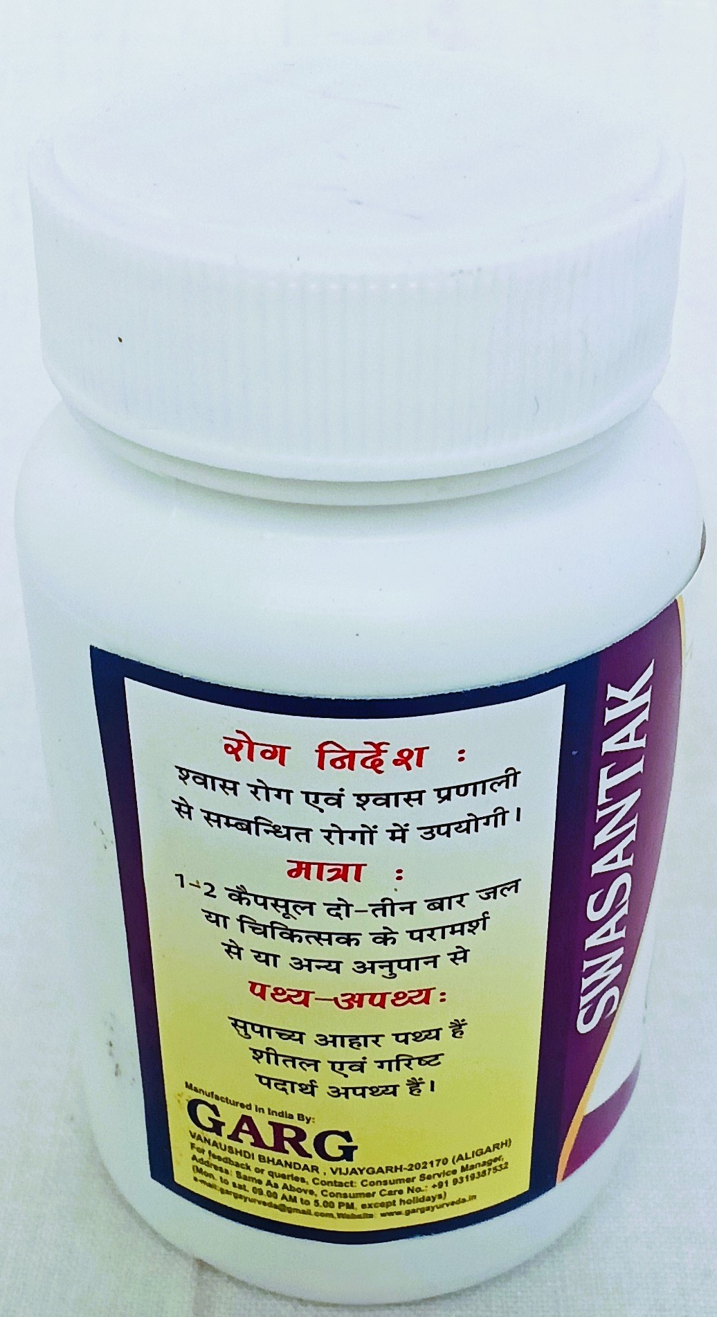 मात्रा एवं अनुपान – साधारण अवस्था में 1-2 कैपसूल सुबह, शाम जल के साथ सेवन करावें। श्वास की तीव्र अवस्था में 1-2 कैपसूल 6-6 घंटै पर जल के साथ सेवन करने से विशेष लाभ होता है।