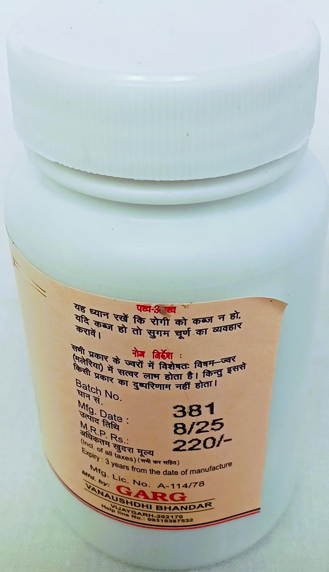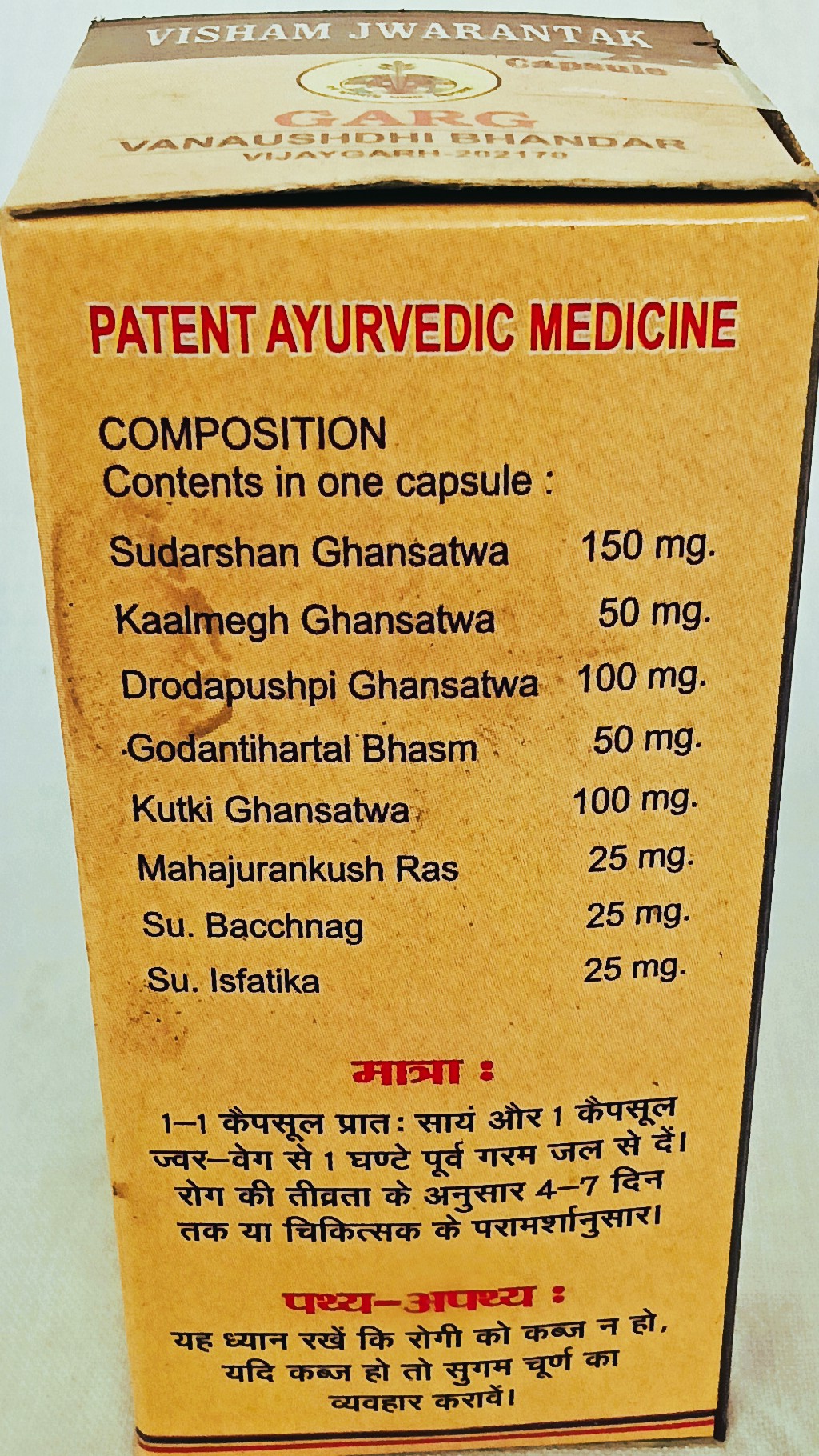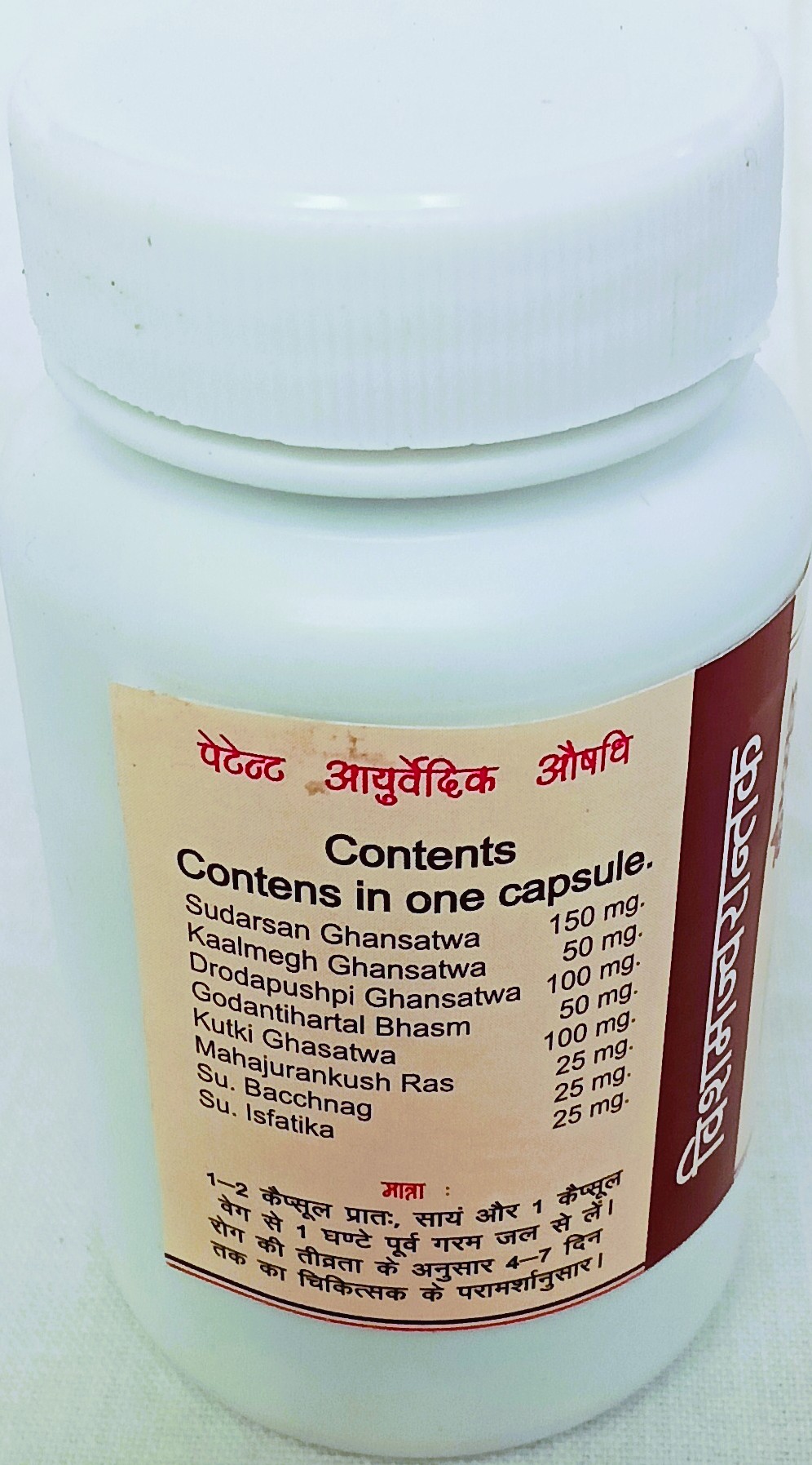 घटक- 1 कैपसूल में घटकों की मात्रा – सुदर्शन घनसत्व 150 मिग्रा., कालमेघ घनसत्व 50 मिग्रा., द्रोणपुष्पी घनसत्व 100 मिग्रा., गोदन्ती हरताल भस्म 50 मिग्रा., कुटकी घनसत्व 100 मिग्रा. महाज्वरांकुश रस 25 मिग्रा., शु0 बच्छनाग 25 मिग्रा., शु0 स्फटिका 25 मिग्रा.।भावना : चिरायता क्वाथ।
